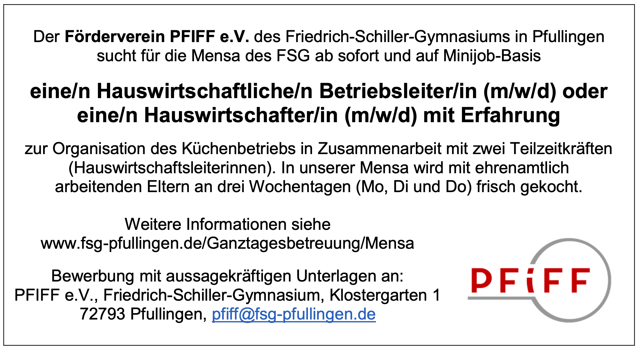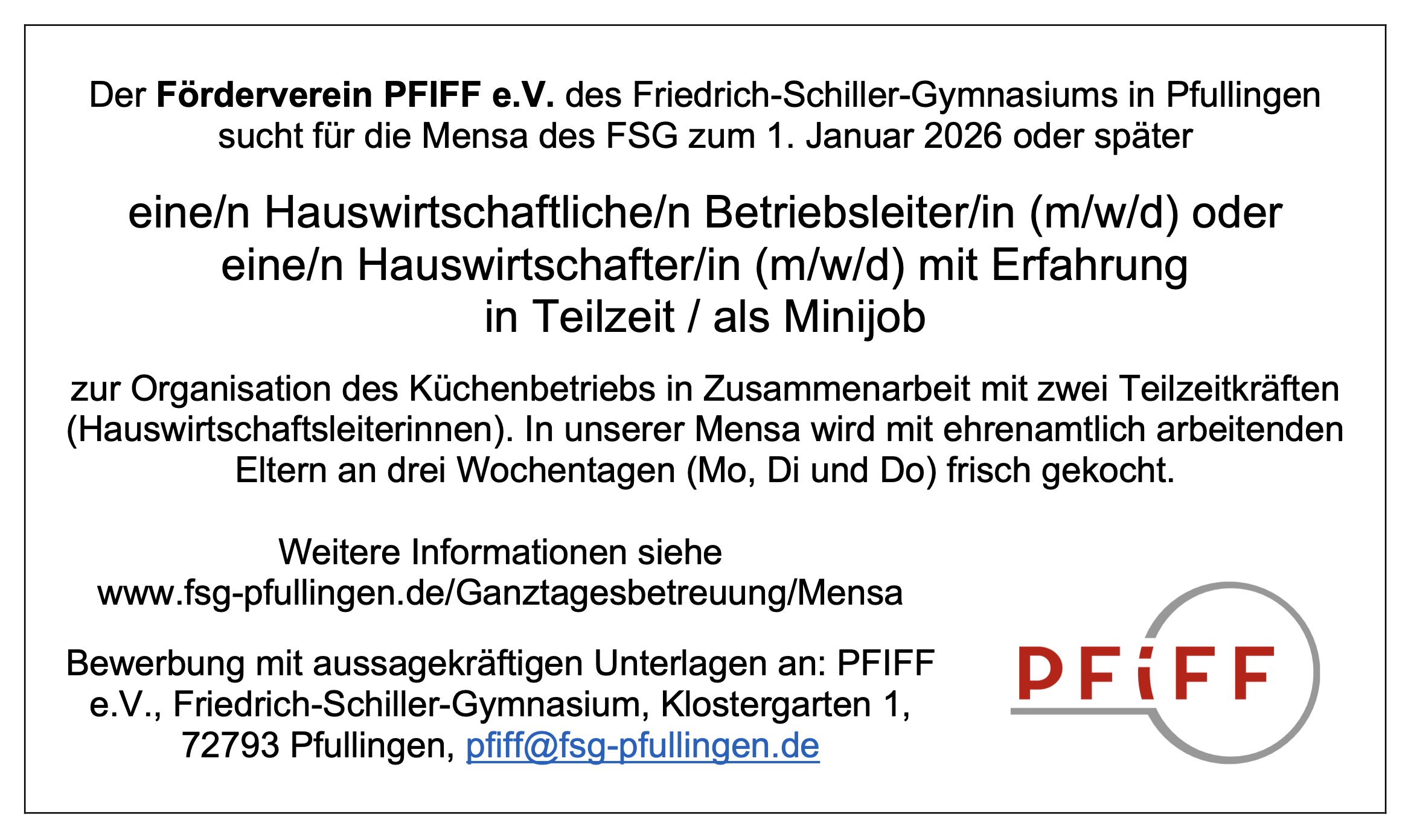 Vielfalt, Toleranz und Respekt prägen das Schulleben am Friedrich-Schiller-Gymnasium. Der abwechslungsreiche, lebenspraktische Unterricht vermittelt eine fundierte gymnasiale Bildung, moderne Lernarrangements und eine zeitgemäße mediale Ausstattung haben die bestmögliche individuelle Förderung zum Ziel. Unser Ganztagesbetrieb umfasst neben der Mensa, der Mediothek und dem Schiller-Club zahreiche spannende Angebote. Wir sind eine aktive und lebendige Schule, in die sich jede und jeder mit Kopf, Herz und Hand einbringen kann.