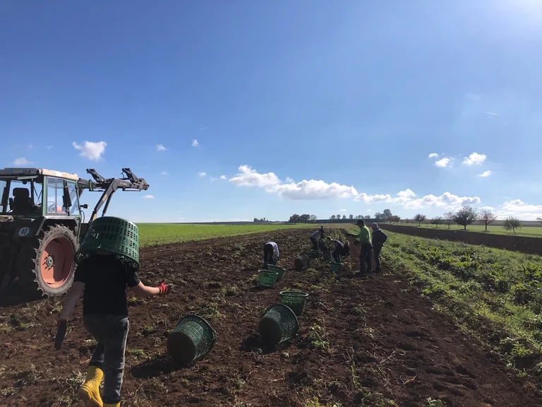 Währenddessen war ein Teil der Feldgruppe auf dem Feld und hat die übriggebliebenen Maiskolben eingesammelt. Dann wurden die Kartoffeln mit dem Traktor aus der Erde geholt, alle durften mal fahren! Der andere Teil der Gruppe war im Garten und hat Sellerie, Lauch, Petersilie und Brokkoli geerntet. Danach wurden die Bewässerungsschläuche aus der Erde gezogen und auf übergroßen Klopapierrollen aufgewickelt. Bevor die Schläuche aufgewickelt wurden, haben wir sie abgemessen. Zum Schluss setzte sich ein Kind in eine Schubkarre und wurde geschoben. Nach dem Mittagessen wurden Kartoffeln eingesammelt und nach der Kuchenpause sortiert. Der Rest hat auf dem Feld noch mehr Kartoffeln eingesammelt und Futterrüben aus der Erde gezogen. Dann gab es Abendbrot und wir hatten noch etwas Freizeit.