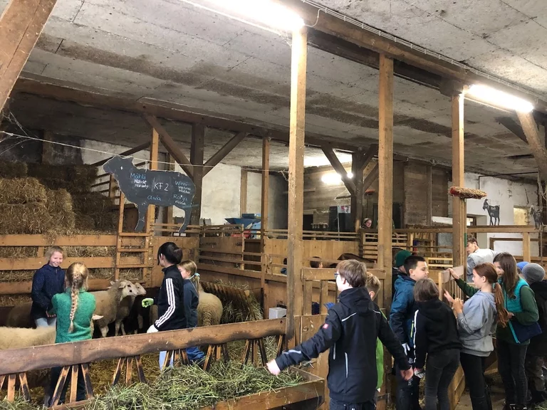 Die Arbeit begann für die Stallgruppe um 6:30 Uhr. Wir wurden in zwei Gruppen eingeteilt, die Kuh- und Ziegengruppe. Die Kuhgruppe hat die Kühe gemolken und ausgemistet und die Ziegengruppe hat die Ziegen gemolken, den Schweinestall ausgemistet und die Tiere gefüttert. Zusammen haben wir nach dem Frühstück die Tiere auf die Weide gebracht. Danach wurde nochmal ausgemistet.